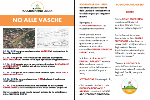 E' inammissibile che l'amministrazione comunale di Poggiomarino, nella persona del vicesindaco Giuseppe Annunziata, non si sia opposta fermamente alla realizzazione di due vasche di laminazione, nella zona di Longola, a pochi metri dal sito archeologico. Questa opera, che rischia di devastare la parte di territorio che in futuro potrebbe diventare quella di sviluppo per Poggiomarino, toglierà circa 10 mila metri quadrati di terreno fertile ai nostri agricoltori. Terreno fertile destinato a diventare paludoso e contenitore dei rifiuti di ogni tipo che il fiume trasposta. L'associazione Poggiomarino Libera ribadisce fermamente la propria contrarietà alla realizzazione delle vasche di laminazione nella località di Longola, vasche che, secondo il parere di molti dei tecnici che abbiamo avuto modo di ascoltare, sono completamente inutili per risolvere il problema allagamenti e dell'inquinamento del fiume Sarno! Il nostro lavoro di informazione e sensibilizzazione sull'argomento non finisce qui, seguiranno altre iniziative al riguardo.